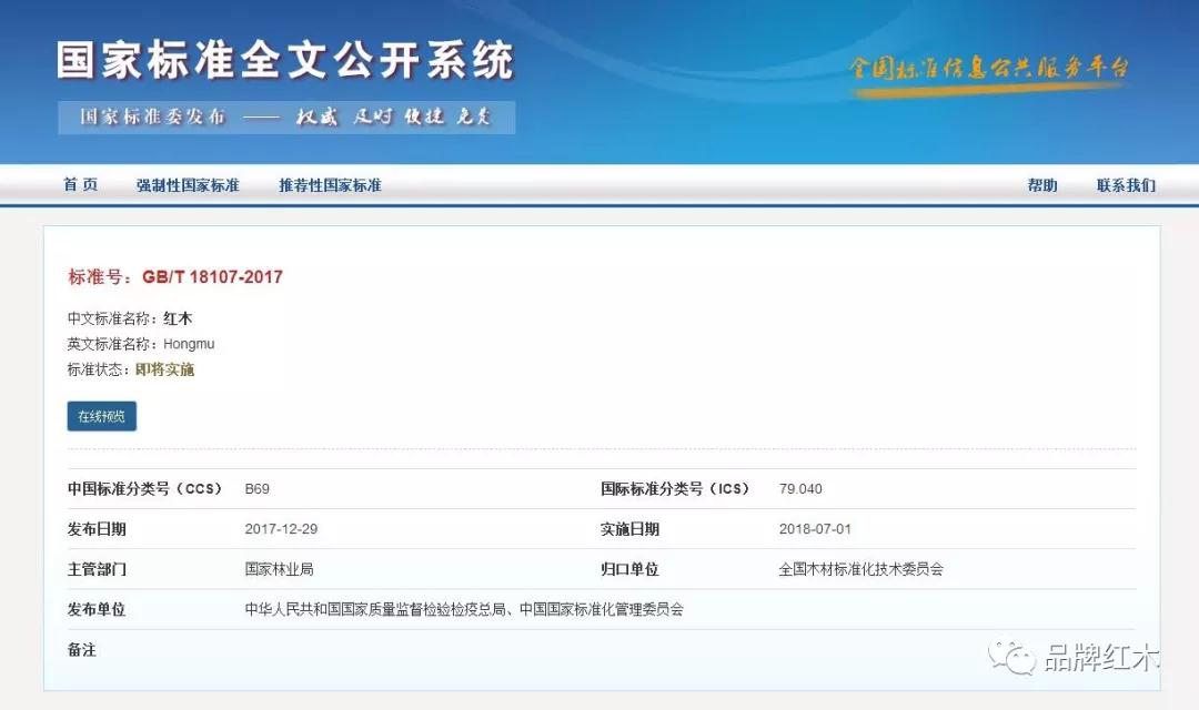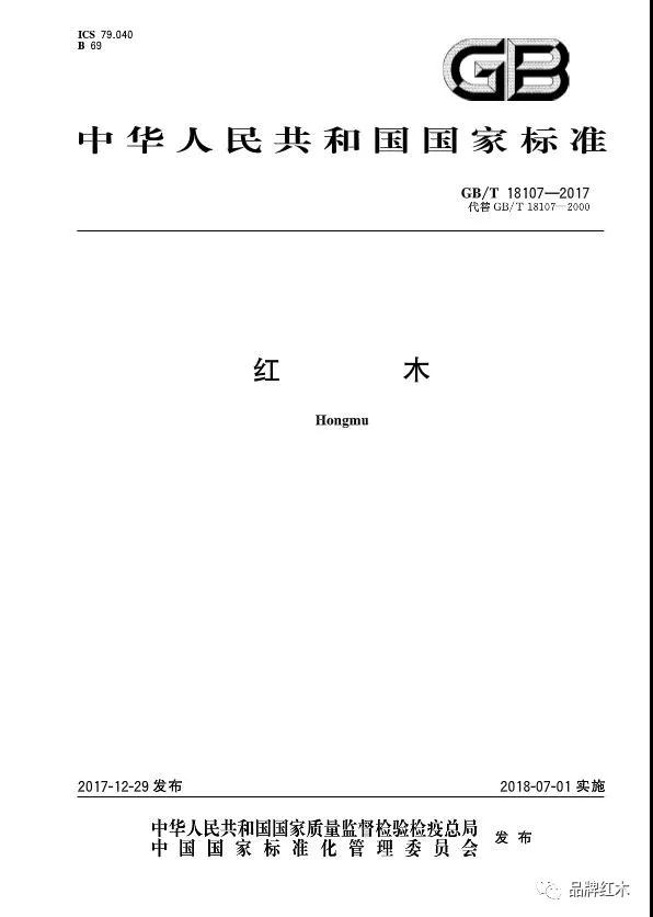 近日,中国国家标准化管理委员会官网公布GB/T 18107-2017《红木》详细内容,此标准将代替原《红木》国家标准(标准号为GB/T 18107-2000),于2018年7月1日开始执行实施。此外,同期将实施的GB/T 35475-2017《红木制品用材规范》内容也进行公布。