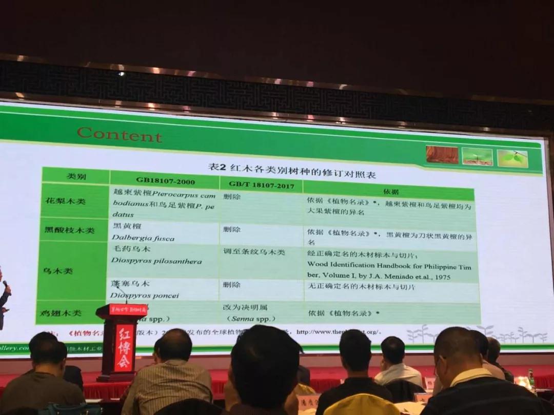 在会议上,由殷亚方老师(中国林业科学院研究研究员,中国林产工业系会红木分会秘书长)为我们解读新的国家标准GB1810-72017【红木】.新版国标【红木】由原来的33种删减合并至29种。1其中花梨木类越柬紫檀pterocarpus cam bodianus和鸟足紫檀p.pedatus根据植物目录,均为大果紫檀的异名,所以删除此两种。2在黑酸枝木类中的黑黄檀Dalbergia fusca刀状黑黄檀的异名,被删除.3乌木类中的毛药乌木Diospyros pilosanthera调至条纹乌木类,蓬塞乌木Diospyros poncei被删除,4原鸡翅木类中的铁刀木属改为决明属。 “此次的更改并非是随意而已,而是通过多种鉴定方式重新去确认这个变更。不过,树种更改也只是合并同种不同名的树种而已,以上几个树种都是不同时期、不同人对同一树种的不同称呼,此次标准只是把这些名称统一,便于以后的交流。”《红木》标准主要起草人、中国林业科学研究院研究员殷亚方的原话。 新国标红木的实施是在2018年的7月1日,作为木材进口报关公司,首当其冲是必然的。我们从本职去考虑这个问题,当这些红木被合并后,那在我们进口清关的过程中,又会有产生什么样的变动,海关和商检这边又会有什么新的要求?实际操作与政策能否同步?会后我们与殷老师进行了一些探讨。不过可以肯定的是,在7月1号后,我们申报的品名不能再以被合并或者删除的品名进行申报。